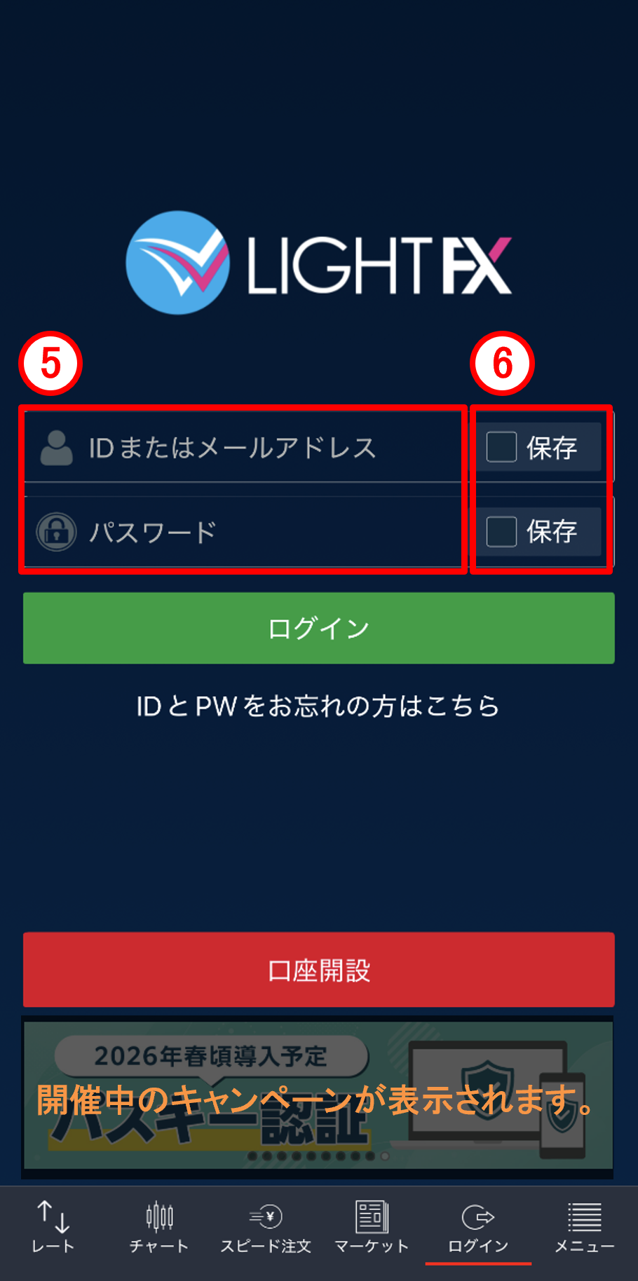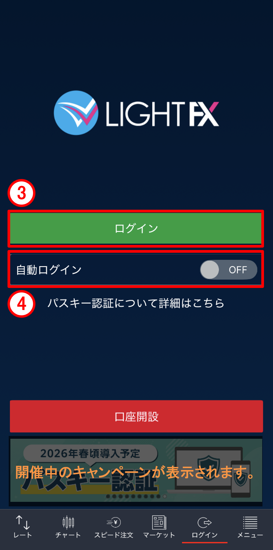 - ①スマートフォンの画面から「LIGHT FX」のアイコンをタップすると、レート一覧画面が表示されます。