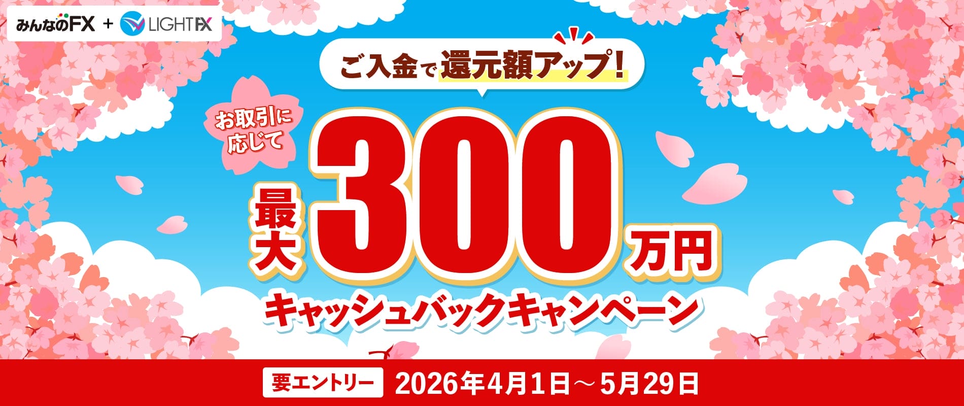 『みんなのFX』『LIGHT FX』において、2026年4月1日(水)~2026年5月29日(金)の期間におきまして、「最大300万円キャッシュバックキャンペーン」を開催いたします。
